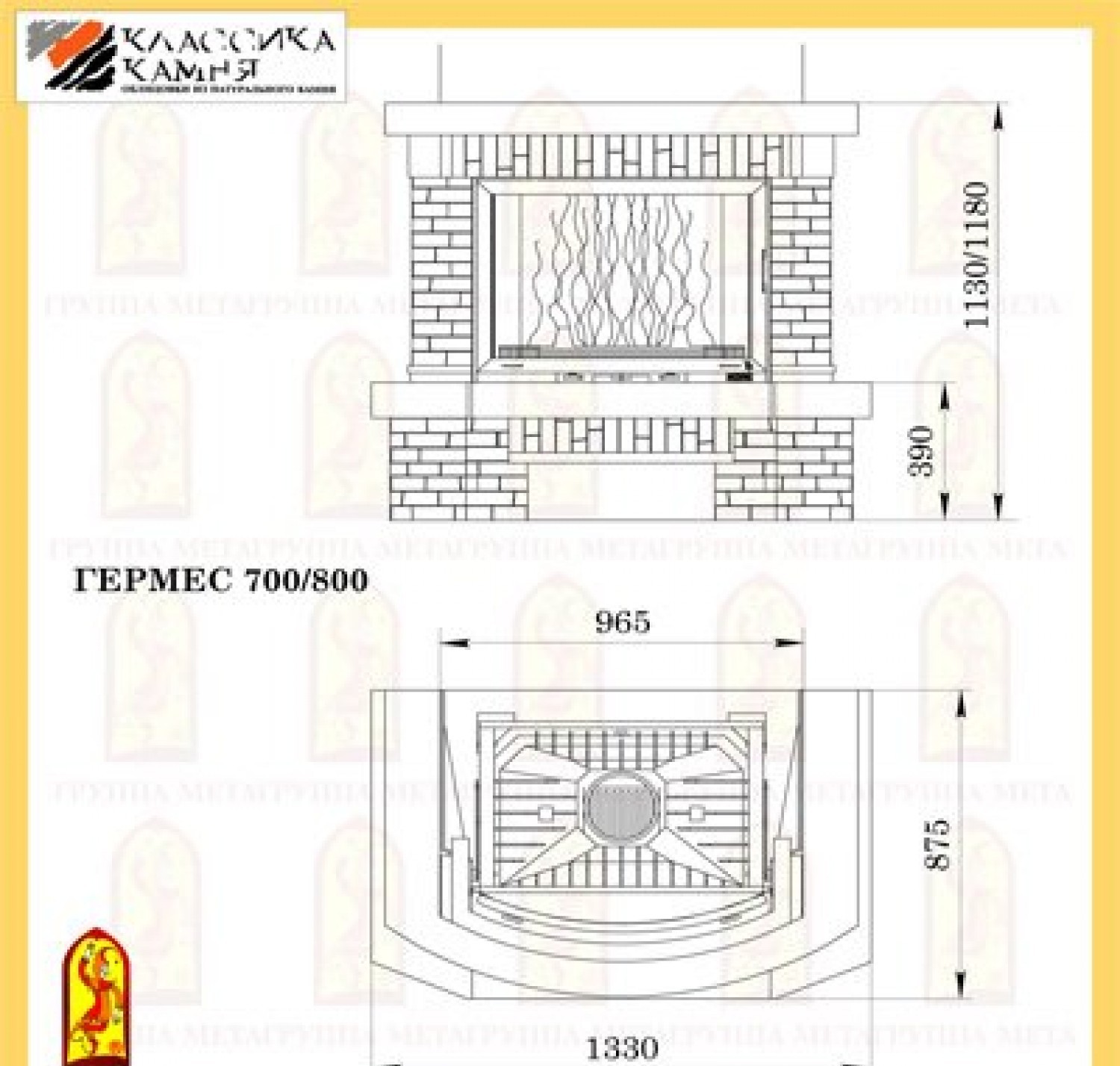 Облицовка ГЕРМЕС 700/800 изготовлена из колотого доломита розово-красного цвета в сочетании с мрамором с обработкой Антик серо-бежевого оттенка. Оригинальная каминная балка выполнена из МДФ шпона дуба и послужит полкой для латунных или бронзовых аксессуаров, рамок с фотографиями и проч.