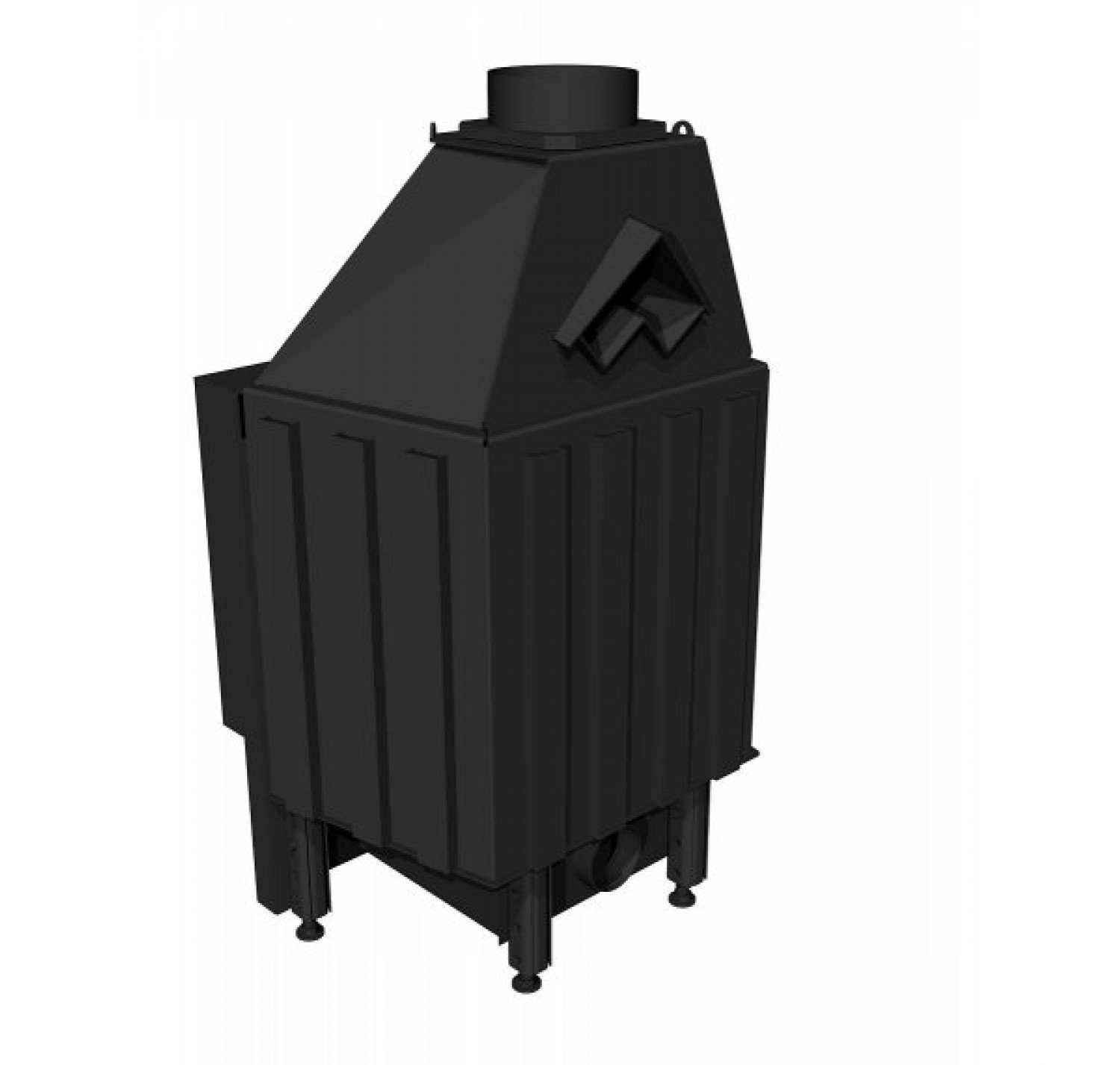 Корпус каминной топки выполнен из жаропрочной стали, колосники и патрубки из чугуна.