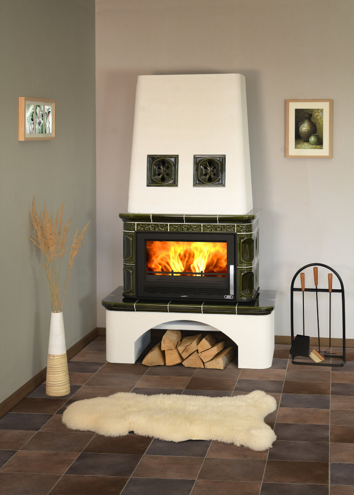 Отопление дома камином это хорошее решение при отсутствии природного газа и постоянных перебоях с электричеством. Уютный камин скандинавского деревенского типа Laponie (Лапландия) оснащен всеми современными атрибутами мощной печи: теплообменником, топкой из жаростойкой стали, каминным коробом, который прячет внутреннее устройство камина. Большая мощность камеры сгорания позволяет обогревать значительный объем (до 300 куб.м). Облицовку чешский производитель ABX выполнил из жаростойкого и долговечного кафеля, благодаря которому после окончания топки теплопередача продолжается. Ассортимент представлен печами зеленого, песчаного и коричневого цветов. Благородный кафель, использованный для облицовкм печи излучает полезные для человека ИК-лучи.